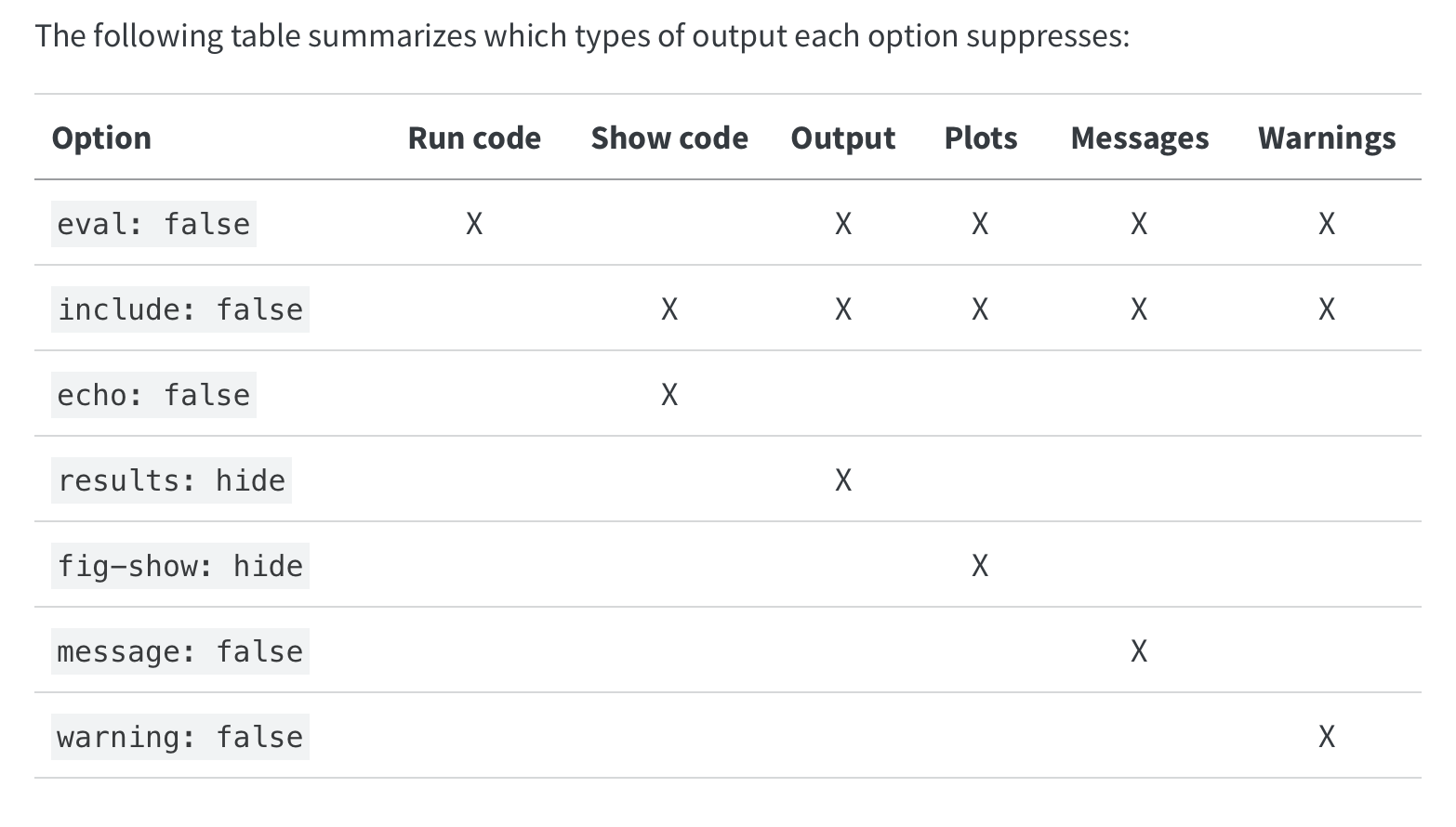 The Quarto document should contain the code that you use to a) load the data (and libraries that you need) and b) execute the analyses to report the statistics. However, your readers probably do not need to see ALL of this code. So experiment / play around with making the code blocks visible for the viewer, and think about what information is most necessary for your audience to see in order to understand your results. Here’s a helpful table on this :)