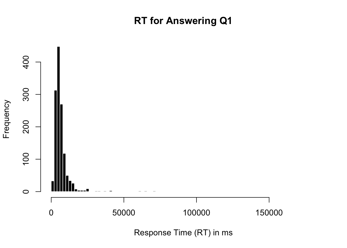 d <-read.csv("../datasets/Protestant Work Ethic/data.csv", sep ="\t")hist(d$Q1E, breaks =100, main ="RT for Answering Q1",xlab ="Response Time (RT) in ms",col ='black', bor ='white')