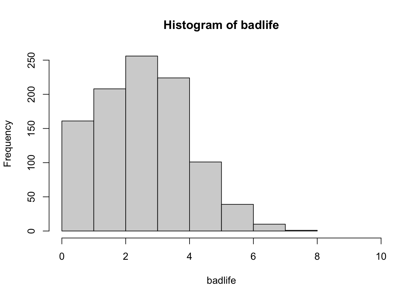 badlife <-array() # WHAT HAPPENS IF I DO THIS????for(i inc(1:1000)){ x <-replicate(10, sample(coinflip, 1, prob =c(.7, .3))) badlife[i] <-sum(x)}badlife
