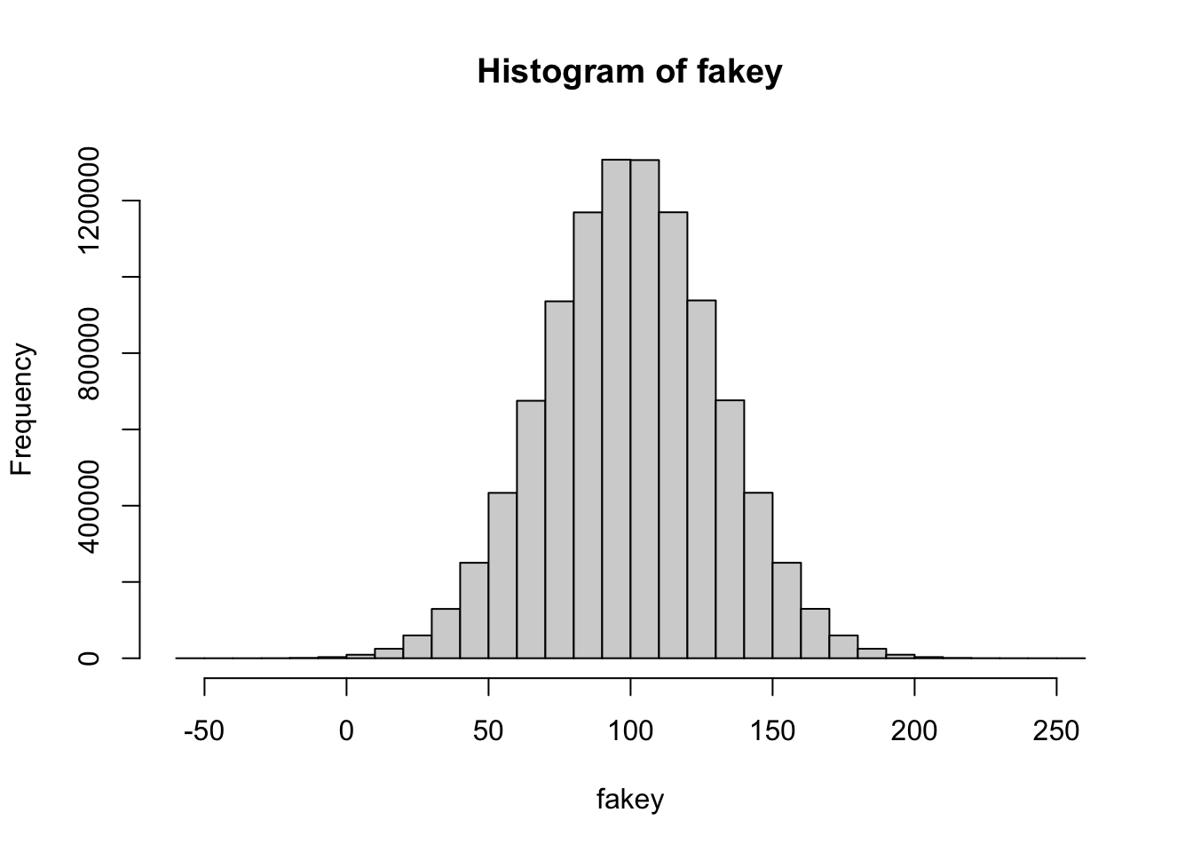 fakey : an object : a fake dataset of 10million values with a mean of 100 and sd of 30.