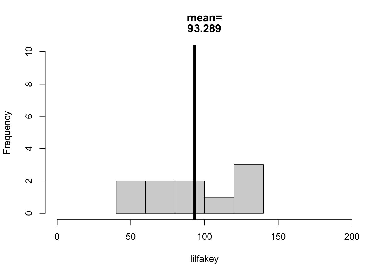 lilfakey <- fakey[sample(1:length(fakey), 10)] # ten random individuals from fakey.hist(lilfakey, xlim =c(0,200), ylim =c(0,10),breaks =5,main =paste(c("mean=", round(mean(lilfakey), 4)), sep =""))abline(v =mean(lilfakey), lwd =5)
