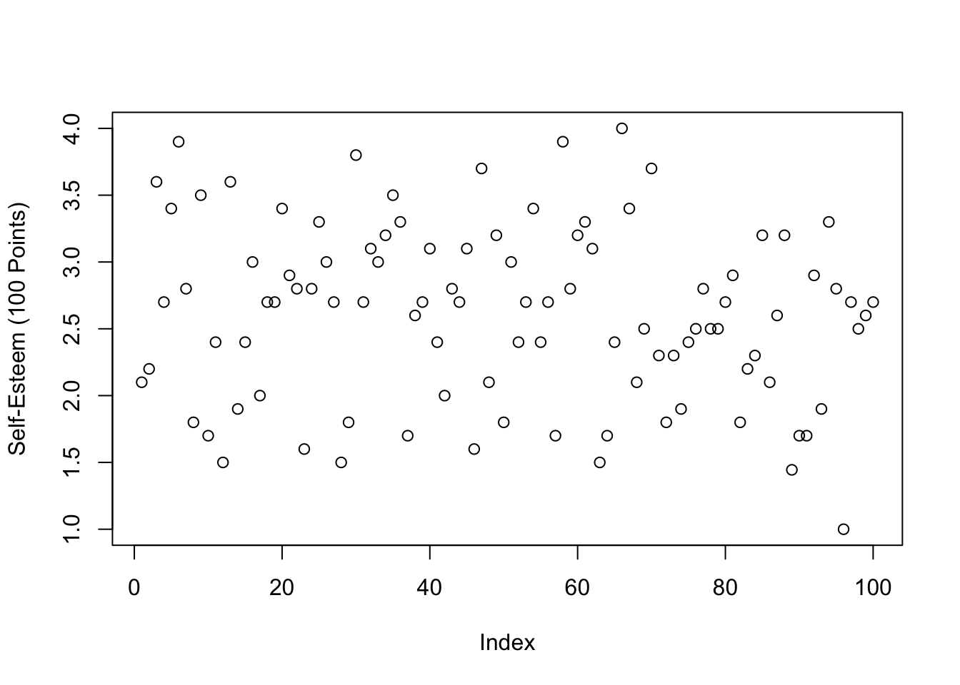 selfes$SELFES <-rowMeans(SELFES.DF, na.rm = T) # creating the scalehist(selfes$SELFES, col ='black', bor ='white', # the graphmain ="Histogram of Self-Esteem", xlab ="Self-Esteem Score", breaks =15)