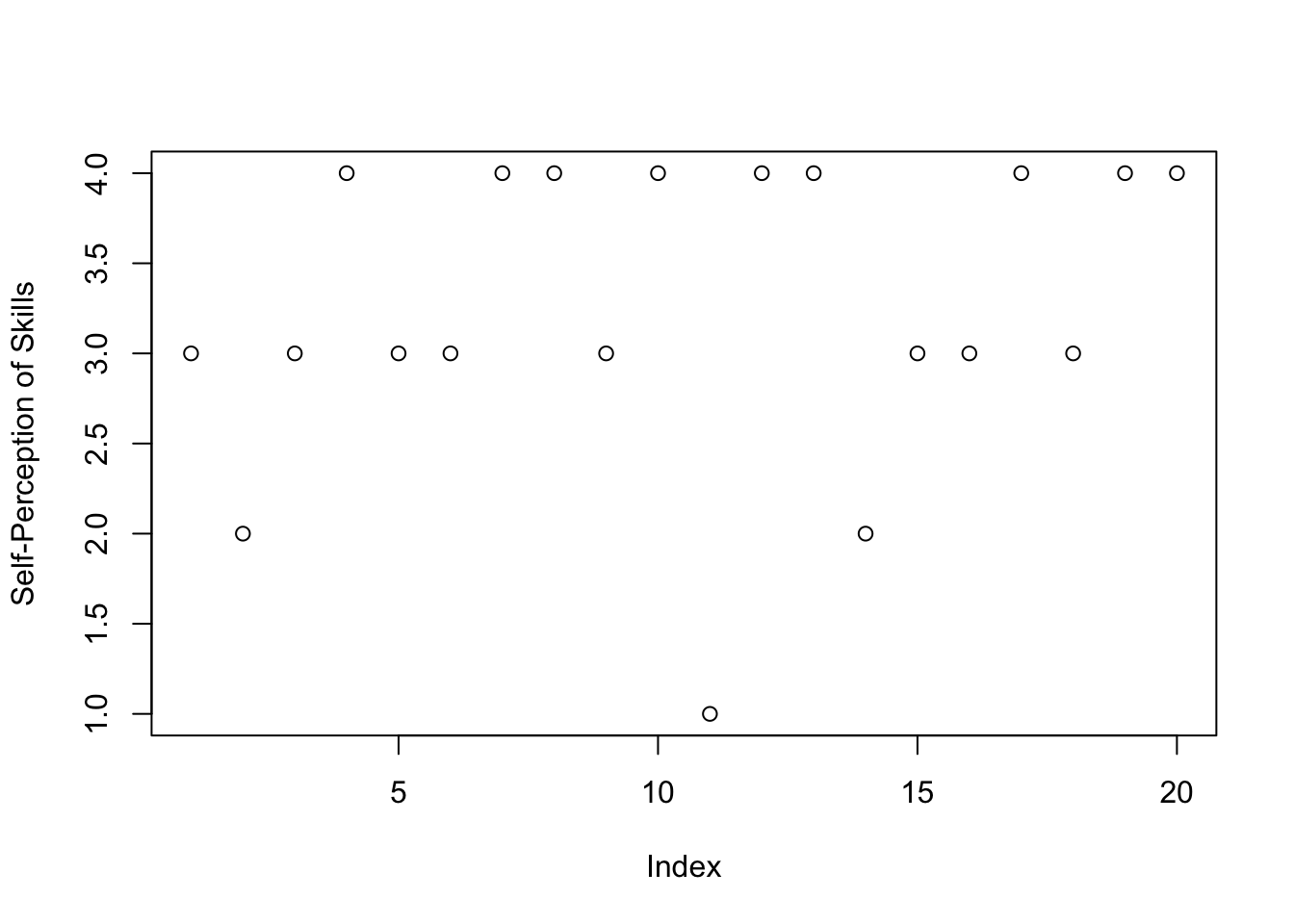 For example, a person who said their R knowledge is a 2 rated their skills as a 1. But this is different from our prediction (the line.)