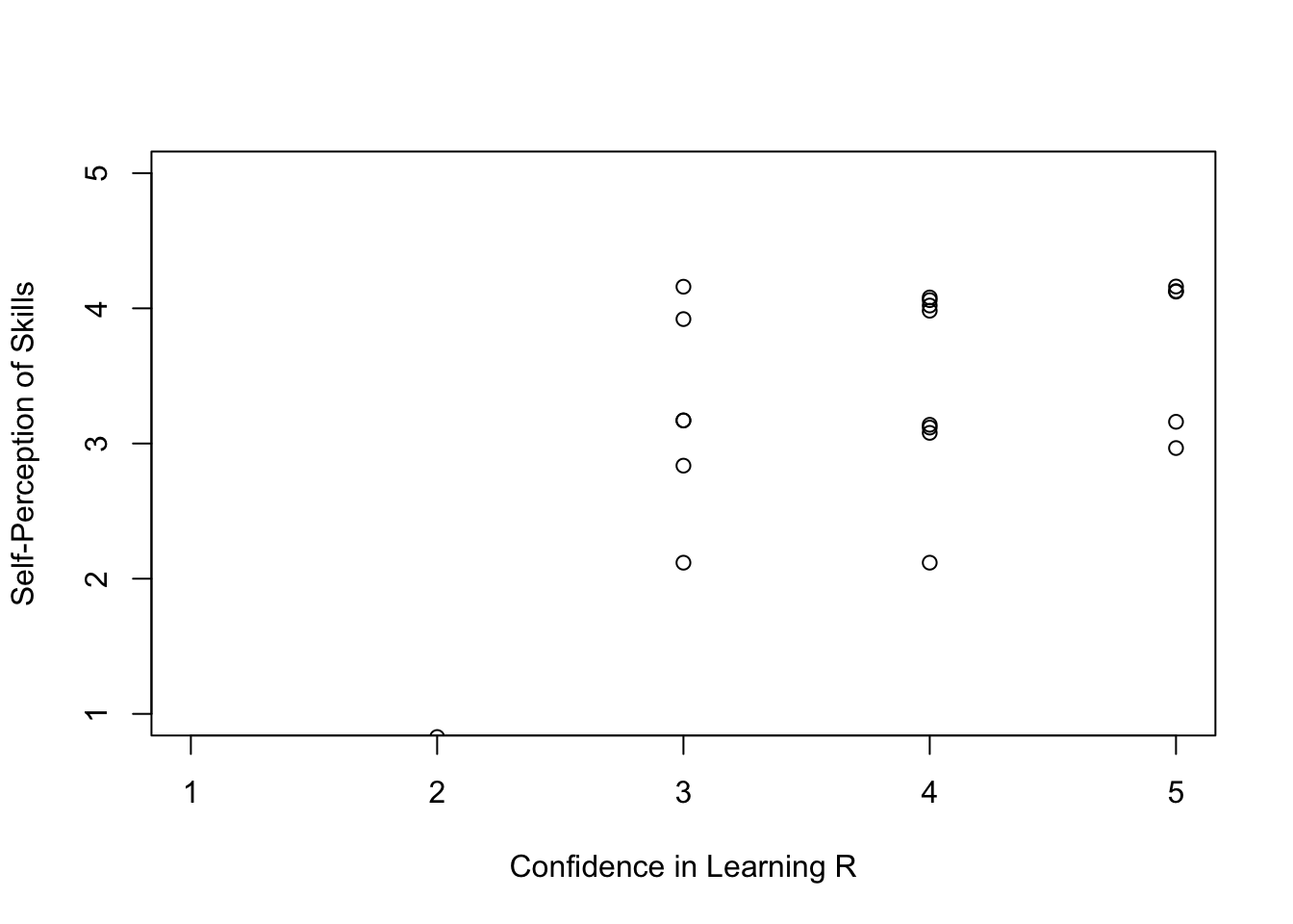 plot(jitter(self.skills) ~ learn.r, data = d, ylab ="Self-Perception of Skills", ylim =c(1,5),xlab ="Confidence in Learning R", xlim =c(1,5)) abline(lm(self.skills ~ learn.r, data = d), lwd =0)