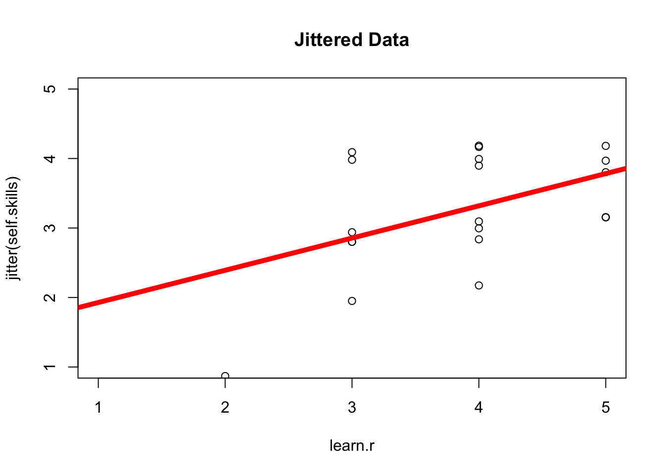 mod1 <-lm(self.skills ~ learn.r, data = d)plot(jitter(self.skills) ~ learn.r, # dv is jittereddata = d, main ="Jittered Data",xlim =c(1,5), ylim =c(1,5))abline(mod1, lwd =5, col ='red')