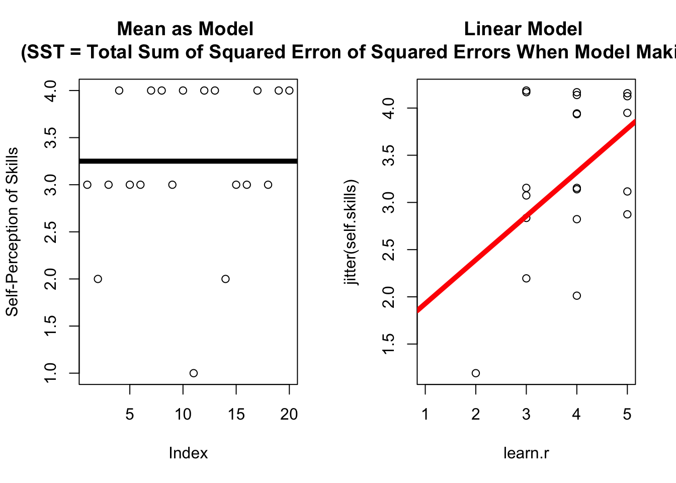 ## Visualizing Our Errors. (distance between actual scores and the line).par(mfrow =c(1,2))plot(d$self.skills, ylab ="Self-Perception of Skills",xlab ="Index", main ="Mean as Model \n(SST = Total Sum of Squared Errors)") abline(h =mean(d$self.skills, na.rm = T), lwd =5)plot(jitter(self.skills) ~ learn.r, data = d, main ="Linear Model \n(SSE = Sum of Squared Errors When Model Making Predictions)", xlim =c(1,5)) # jitteredabline(mod1, lwd =5, col ='red')