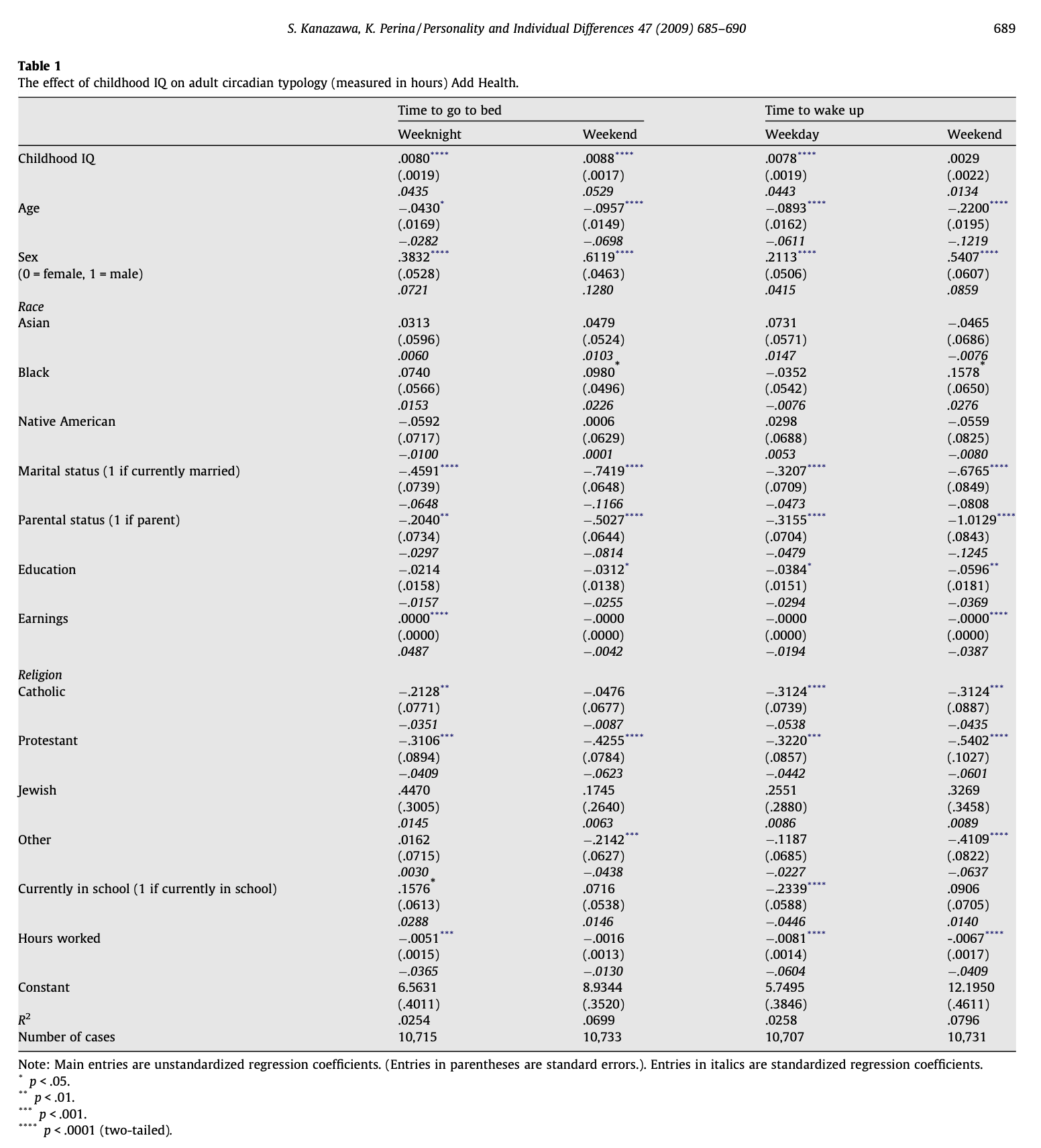 The study below predicted circadian typology (time a person went to bed) from a variety of other variables.