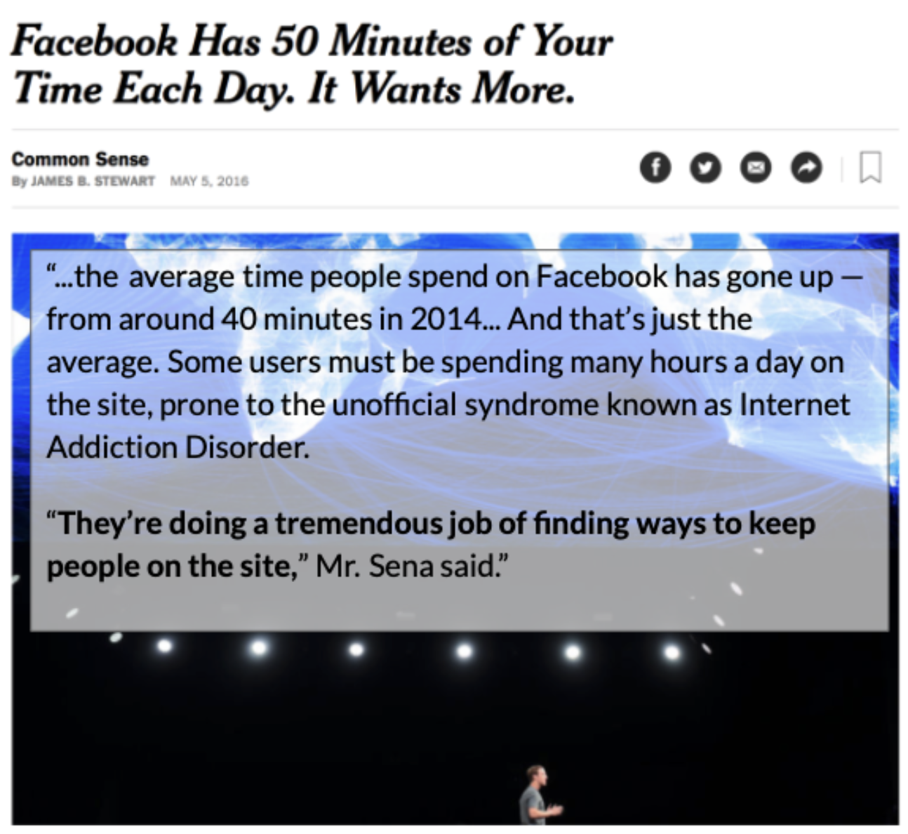 1 Here’s a link to the article where this headline comes from. These data are a little dated, and I couldn’t immediately find more recent data - my guess is Meta does not really want to advertise that people are using the product more and more. However, in reports to investors reports consistent growth in metrics like “ad impressions” and “daily active users”. Let me know if you find other sources to show how technology companies are capturing more and more of our attention!