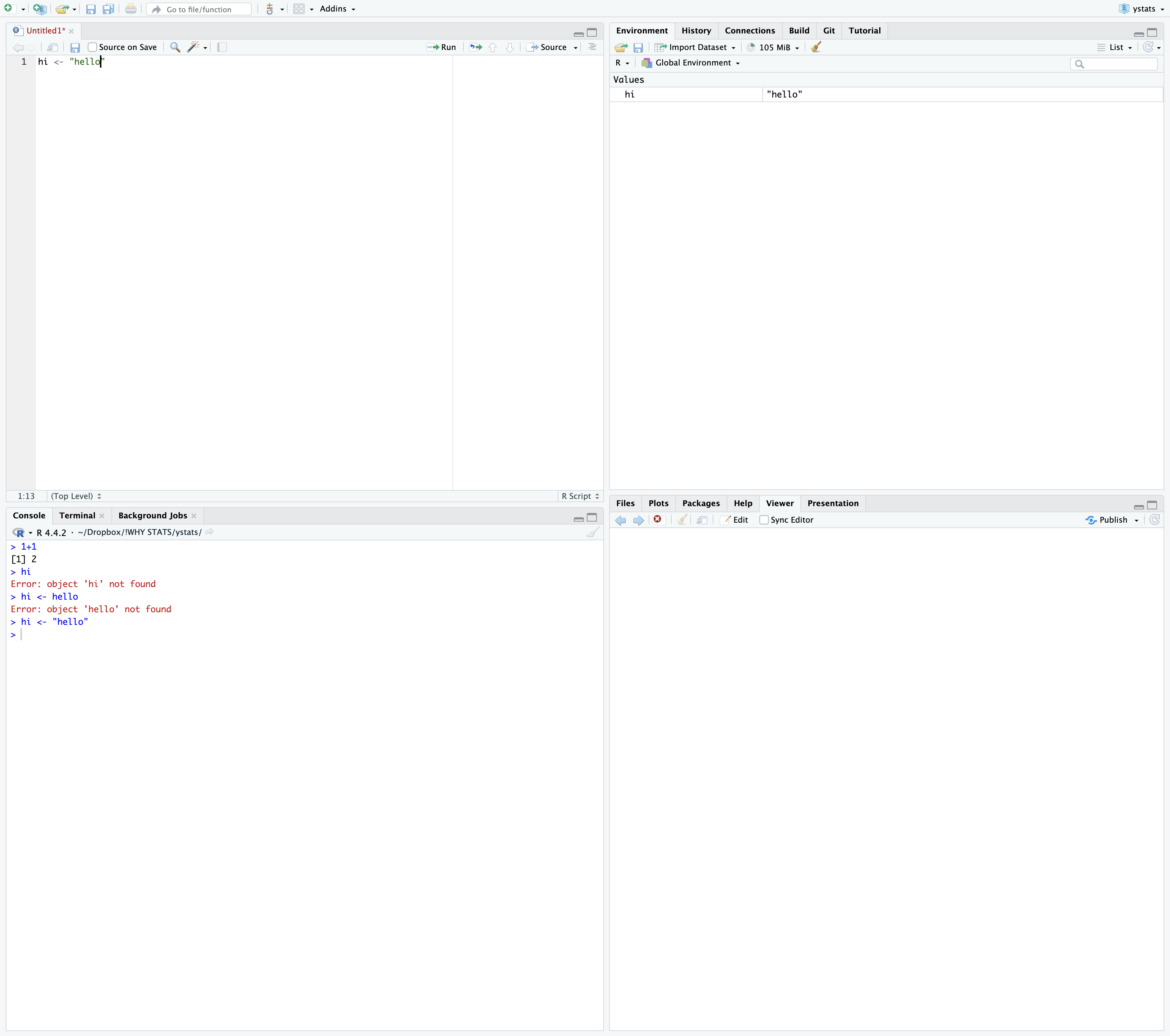 - The R script is at the top left of the IDE, and is a document that you use to write (and organize) code. You will want to do most of your work in the R script, and feel an appropriate level of anxiety when you notice that your Rscript is unsaved (as indicated by the red text and *).