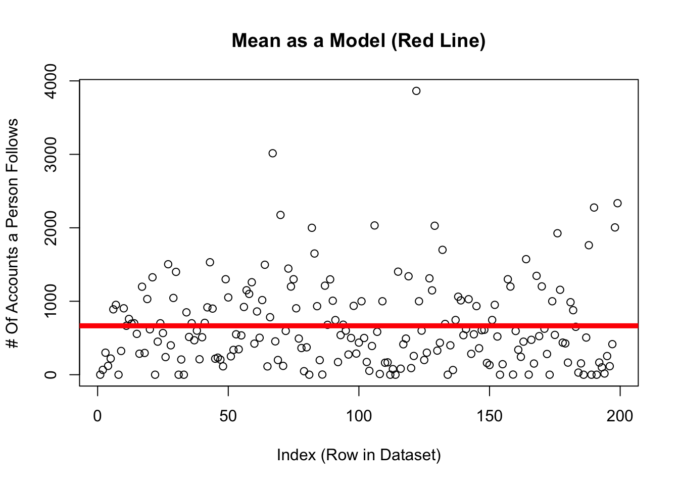 d <-read.csv("~/Dropbox/!WHY STATS/Class Datasets/101 - Class Datasets - FA25/mini_cal_data.csv", stringsAsFactors = T)plot(d$insta.follows, main ="Mean as a Model (Red Line)",xlab ="Index (Row in Dataset)",ylab ="# Of Accounts a Person Follows")abline(h =mean(d$insta.follows, na.rm = T), lwd =5, col ='red')