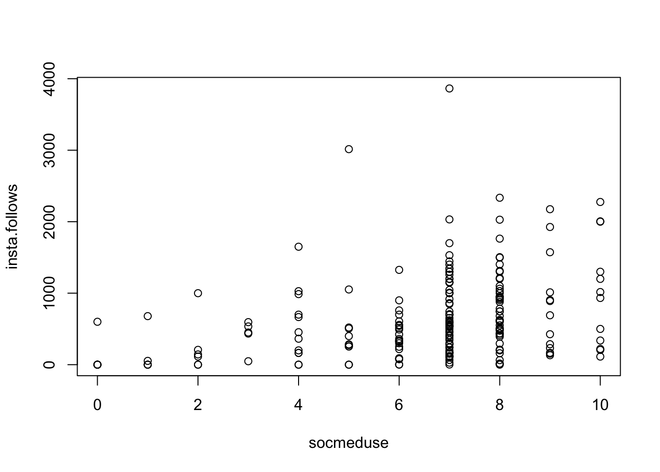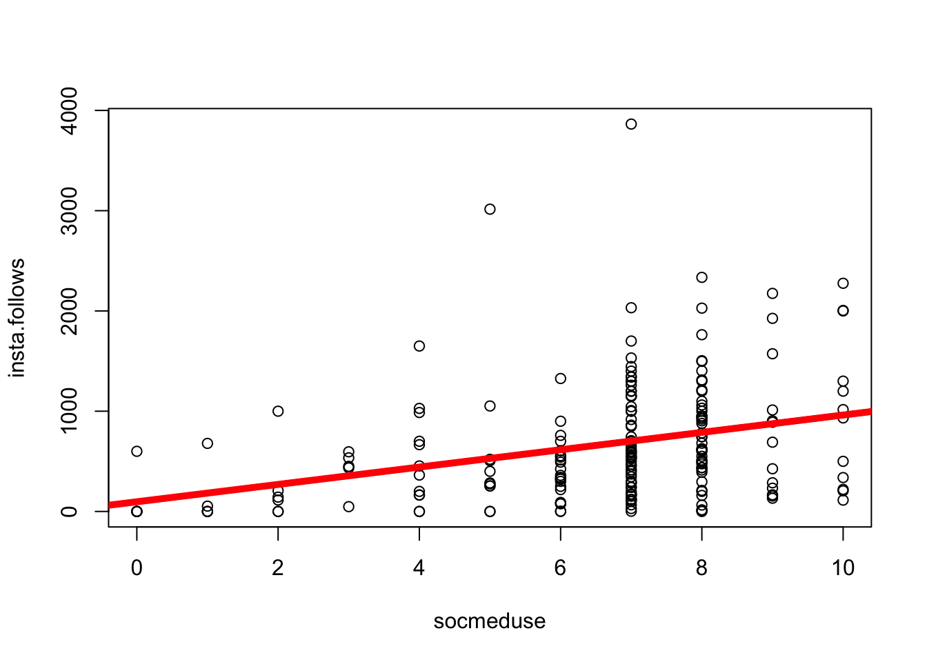 mod <-lm(insta.follows ~ socmeduse, data = d) # defines the model; saves as modplot(insta.follows ~ socmeduse, data = d) # graphs the relationship.abline(mod, lwd =5, col ='red') # draws a red line of width five based on mod