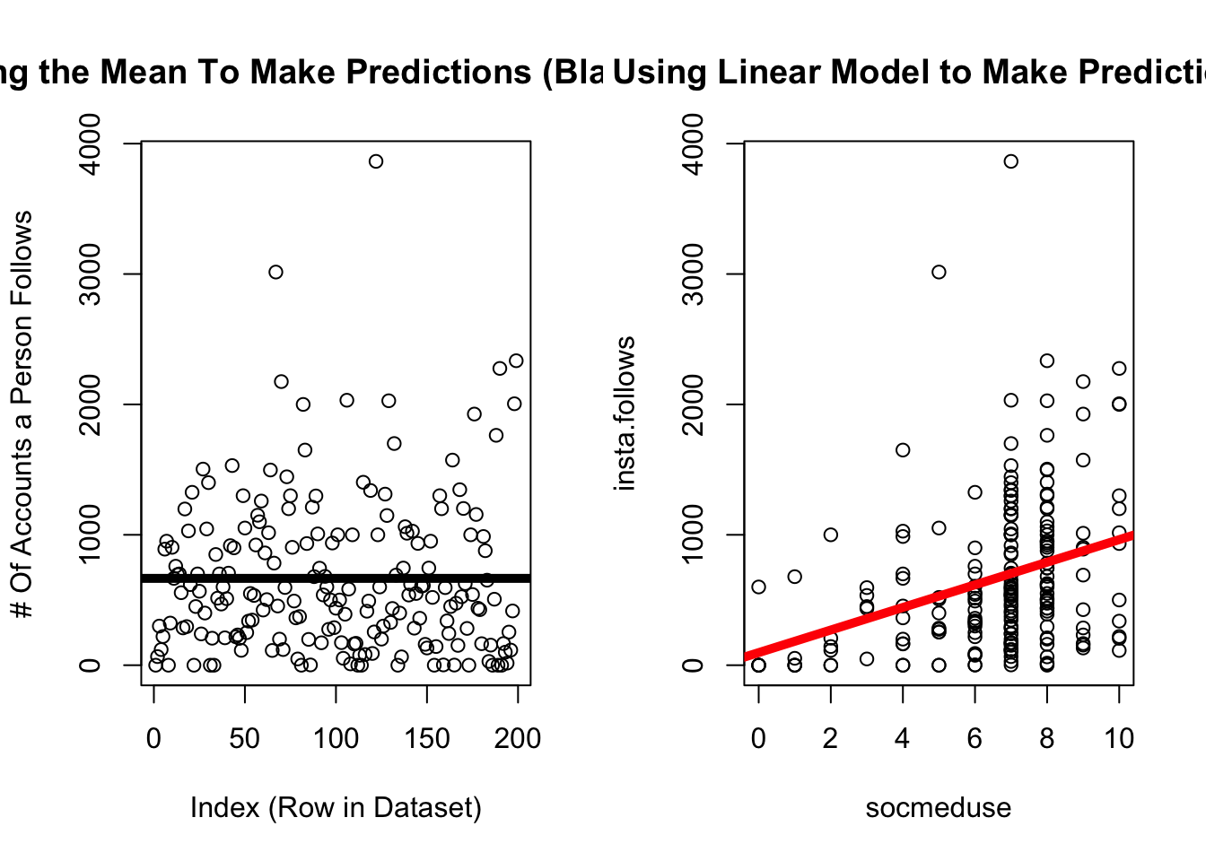 par(mfrow =c(1,2))plot(d$insta.follows, main ="Using the Mean To Make Predictions (Black Line)",xlab ="Index (Row in Dataset)",ylab ="# Of Accounts a Person Follows")abline(h =mean(d$insta.follows, na.rm = T), lwd =5, col ='black')plot(insta.follows ~ socmeduse, data = d,main ="Using Linear Model to Make Predictions") # graphs the relationship abline(mod, lwd =5, col ='red') # draws a red line of width five based on mod