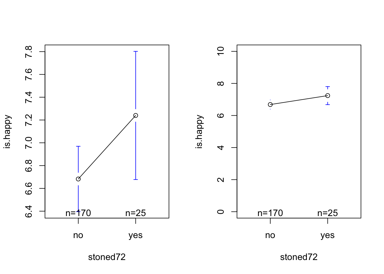 plotmeans(is.happy ~ stoned72, data = d, ylim = c(0,10))Warning in arrows(x, li, x, pmax(y - gap, li), col = barcol, lwd = lwd, :