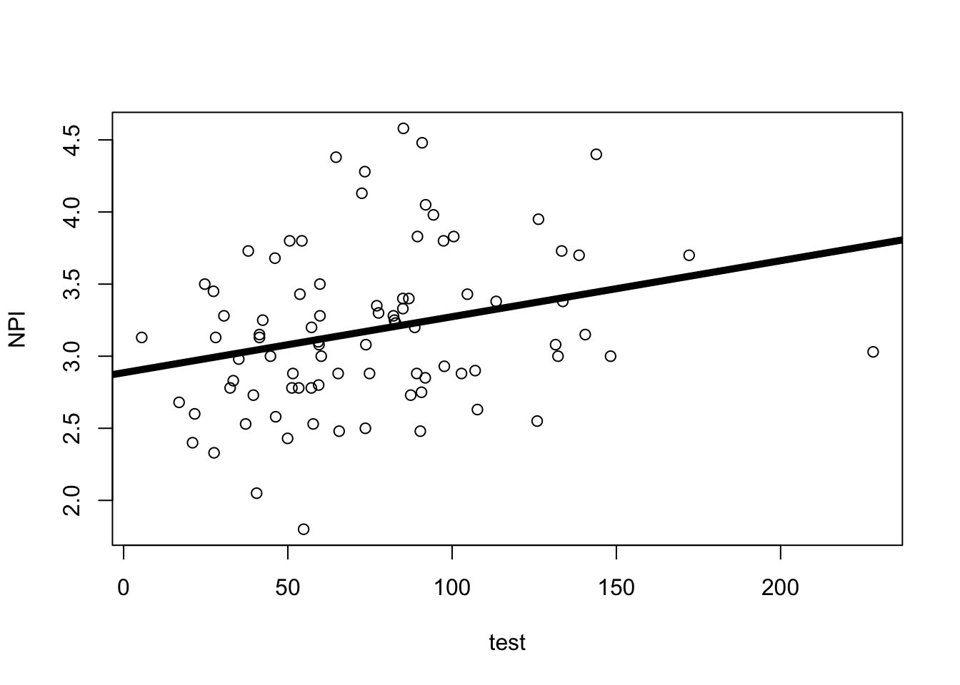 h <-read.csv("~/Dropbox/!WHY STATS/Chapter Datasets/hormone_data.csv", stringsAsFactors = T)mod1 <-lm(NPI ~ test, data = h)plot(NPI ~ test, data = h)abline(mod1, lwd =5)
