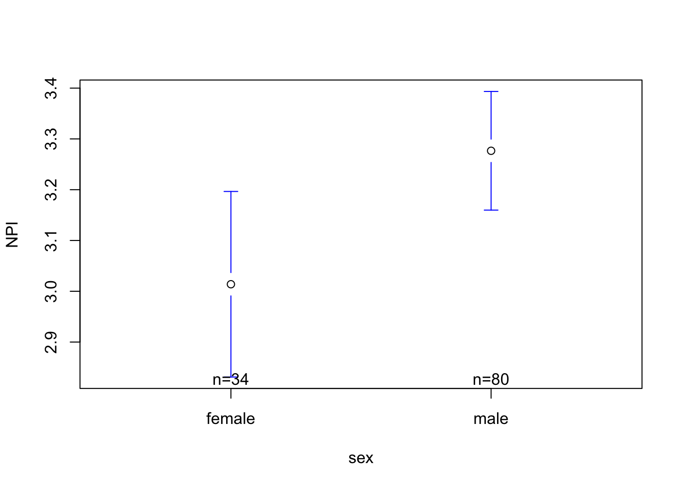 library(gplots)mod2 <-lm(NPI ~ sex, data = h)plotmeans(NPI ~ sex, data = h, connect = F)