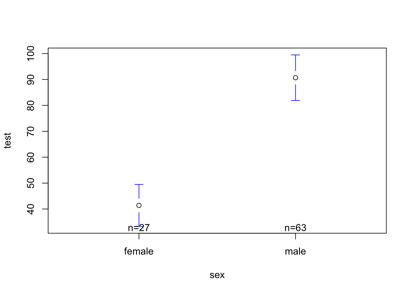mod3 <-lm(test ~ sex, data = h)plotmeans(test ~ sex, data = h, connect = F)