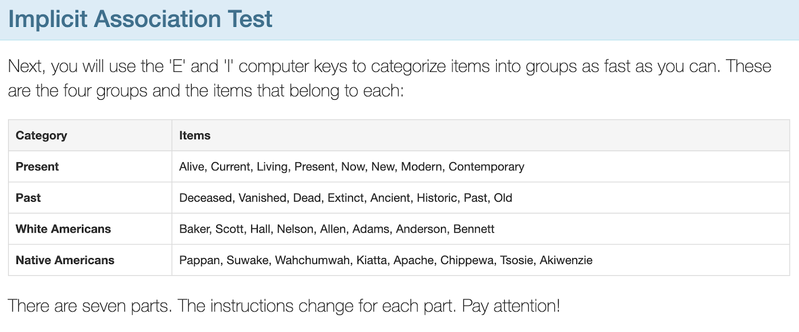 Note : the IAT is not a perfect measure, and there’s a fair amount of debate about whether it is a reliable and valid measure as claimed (see here and here and here for academic examples of some of this debate). FWIW my hot take is that I believe a) implicit measures are really hard to quantify, b) the underlying mechanism that experiences shape our cognition is real, c) we live in a society that prioritizes white and male voices in various ways (history education; modern media; etc.), d) that A-C together would suggest it is very likely people would hold unconscious biases that reflect those in society, and E) it’s important to identify and name those biases if you want to address them. Happy to chat more; thx for attending my footnote talk. Anyway, here’s a link to learn more or take a test for yourself.