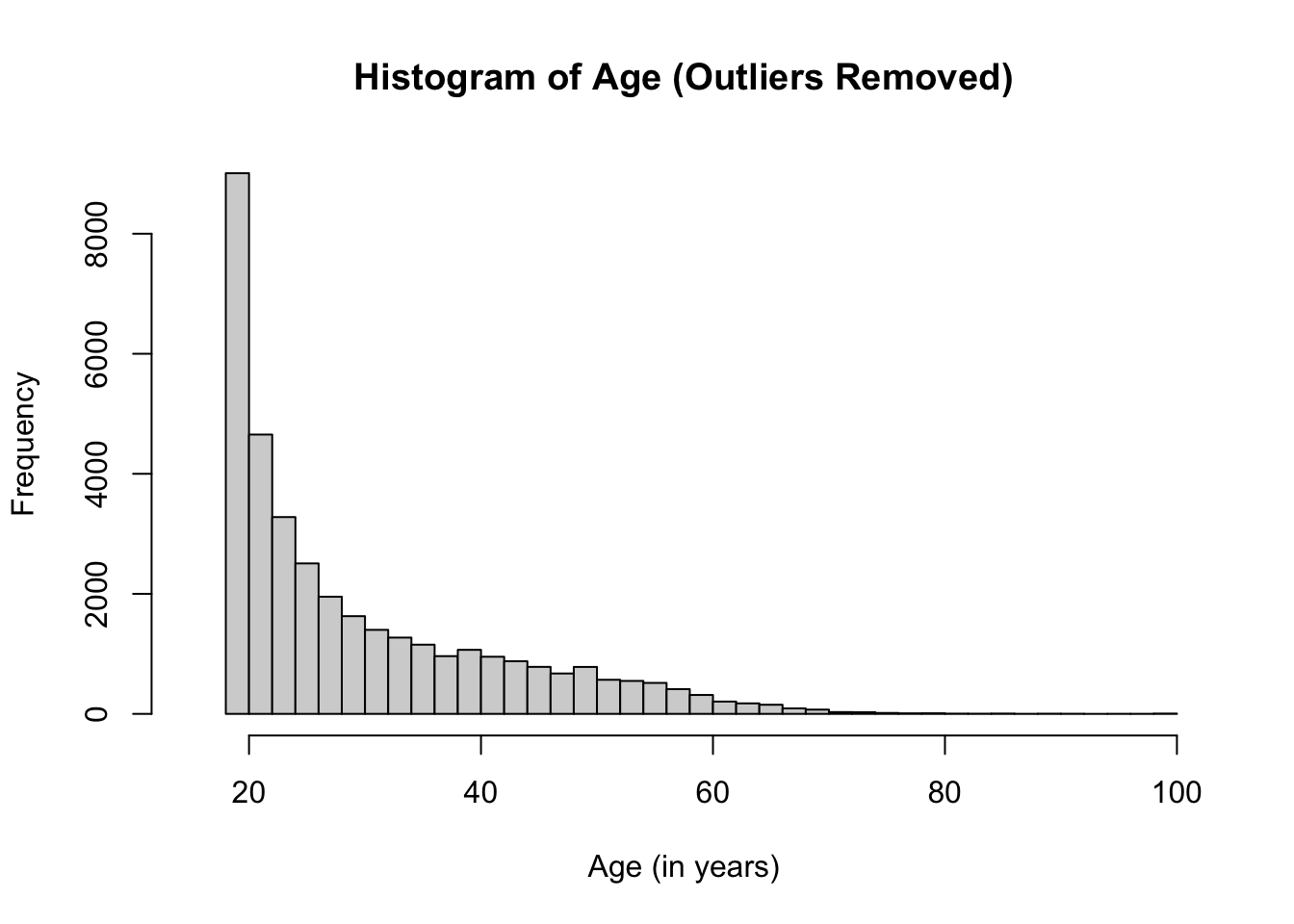 Some people like to define “rules” for excluding data; things like 3x the standard deviation, or 4x the standard deviation. I’m not a huge fan of these rules, since I think they ignore important context for variables, and are hard to always apply (for example, the teenagers in the dataset are within 3 standard deviations, but I still think they could and should be excluded.) It’s best to try and see what the standards in a particular field are, try to make decisions about outlier removal before you collect the data (something called pre-registration, which we will learn about later), document these changes (in your R code), and then be prepared to make different decisions when someone reviewing your research (like an advisor or journal editor) asks you to do something different.