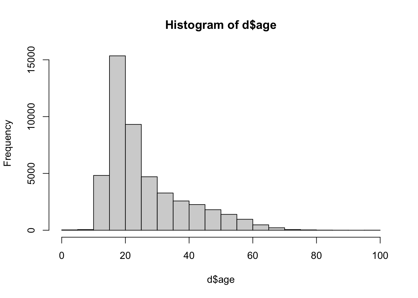 !is.na(d$age) asks R to find the rows where age is NOT and NA values (the ! when used in coding means “not”). You don’t strictly need this code, but it made the output easier to read by removing all the NA values that I don’t care about right now.