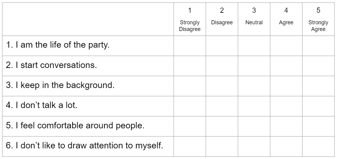 Here’s another example of a likert scale - Extraversion items adapted from Big Five Inventory 2 (Soto & John, 2017).