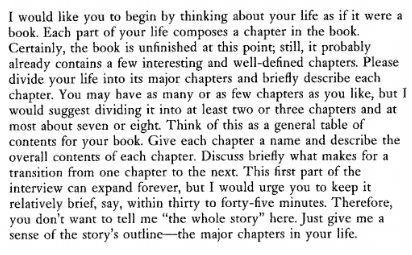 One way to get individuals to tell you what they are like is through a structured interview where researchers ask open-ended questions. One such example of this is the McAdams Life Narrative3. In this structured interview, a trained research assistant asks a set of broad questions to participants over the course of 1 to 3 hours. The research assistant is advised to “feel free to skip some of these questions if they seem redundant or irrelevant, and should follow up with other questions as needed “ but also to “not adopt an advisory or judgmental role, but should instead serve as an empathic and encouraging guide and an affirming sounding board.”