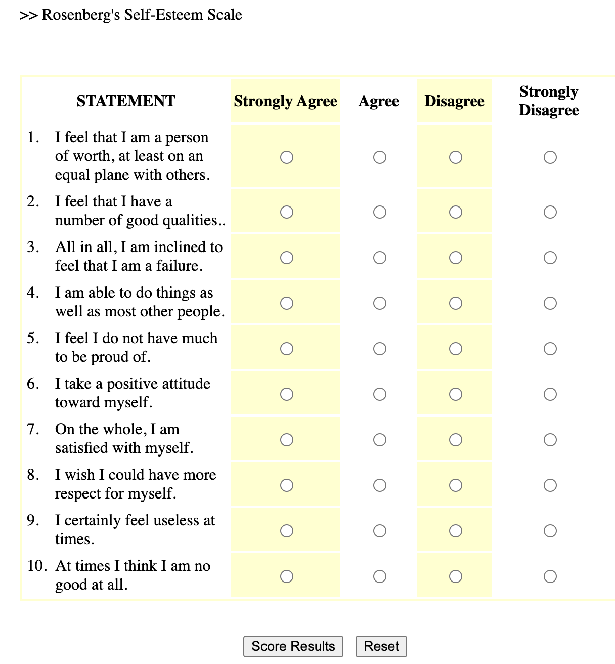 1 Rosenberg, M. (1965). Rosenberg Self-Esteem Scale (RSES) [Database record]. APA PsycTests. Here’s a link to take the survey and get feedback.