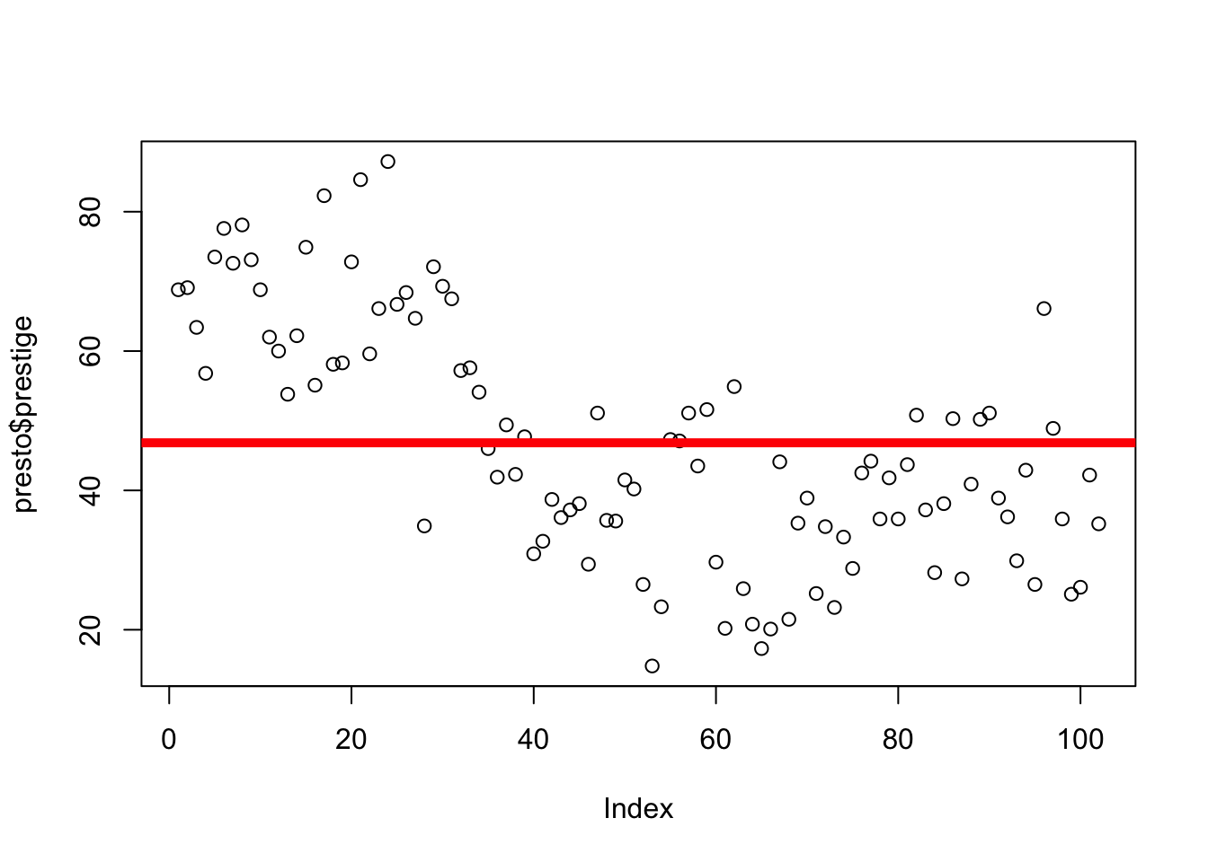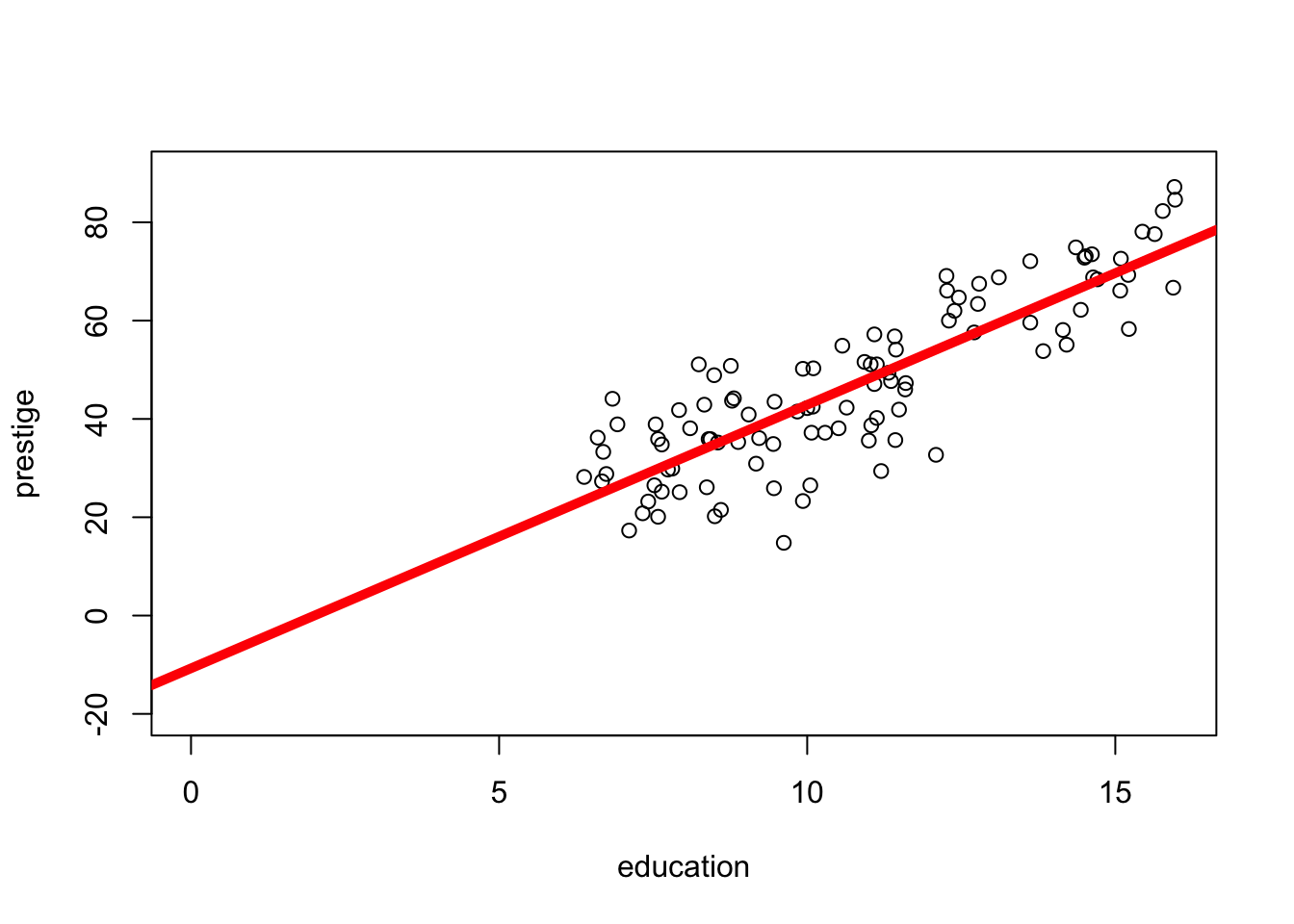 plot(prestige ~ education, data = presto, ylab ="Prestige (Raw Units)",xlab ="Education (Years)") mod <-lm(prestige ~ education, data = presto)abline(mod, lwd =5, col ='red')