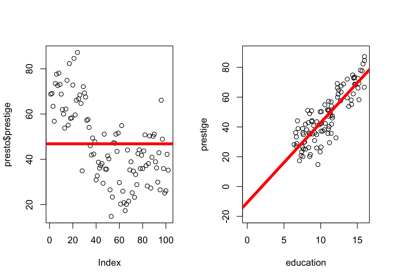 par(mfrow =c(1,2))plot(presto$prestige)abline(h =mean(presto$prestige), lwd =5, col ='red')plot(prestige ~ education, data = presto, # plots the model againxlim =c(0, 16), # changes my x-axis to range from 0 to 16ylim =c(-20,90)) # changes my y-axis to range from -15 to 90abline(mod, col ='red', lwd =5) # this adds the line to my graph.