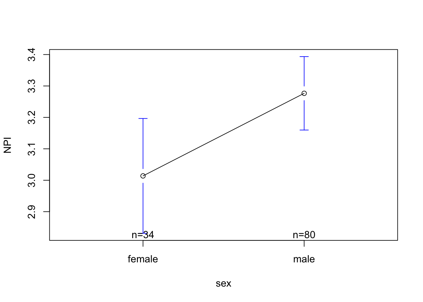 The categorical variable sex is defined on the x-axis. I can see the two groups - female and male. Above each label, R has listed the sample size (n) - the number of individuals in each group (there are 34 females and 80 males who gave narcissism data).