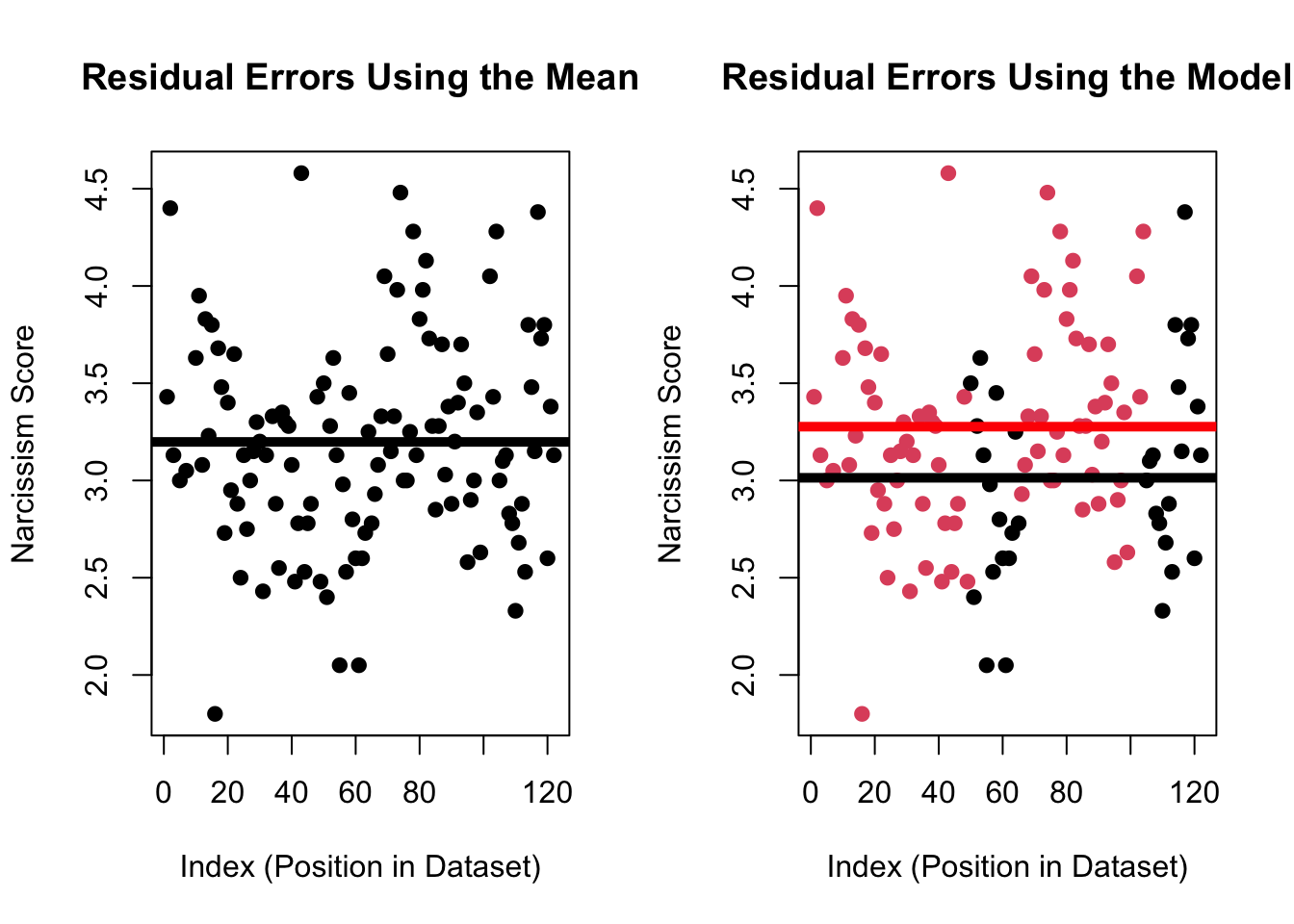 par(mfrow =c(1,2))plot(mba$NPI, pch =19, ylab ="Narcissism Score", xlab ="Index (Position in Dataset)",main ="Residual Errors Using the Mean")abline(h =mean(mba$NPI, na.rm = T), lwd =5)plot(mba$NPI, pch =19, col = mba$sex, ylab ="Narcissism Score", xlab ="Index (Position in Dataset)",main ="Residual Errors Using the Model")abline(h =coef(mod)[1], lwd =5, col ='black')abline(h =coef(mod)[1] +coef(mod)[2], lwd =5, col ='red')