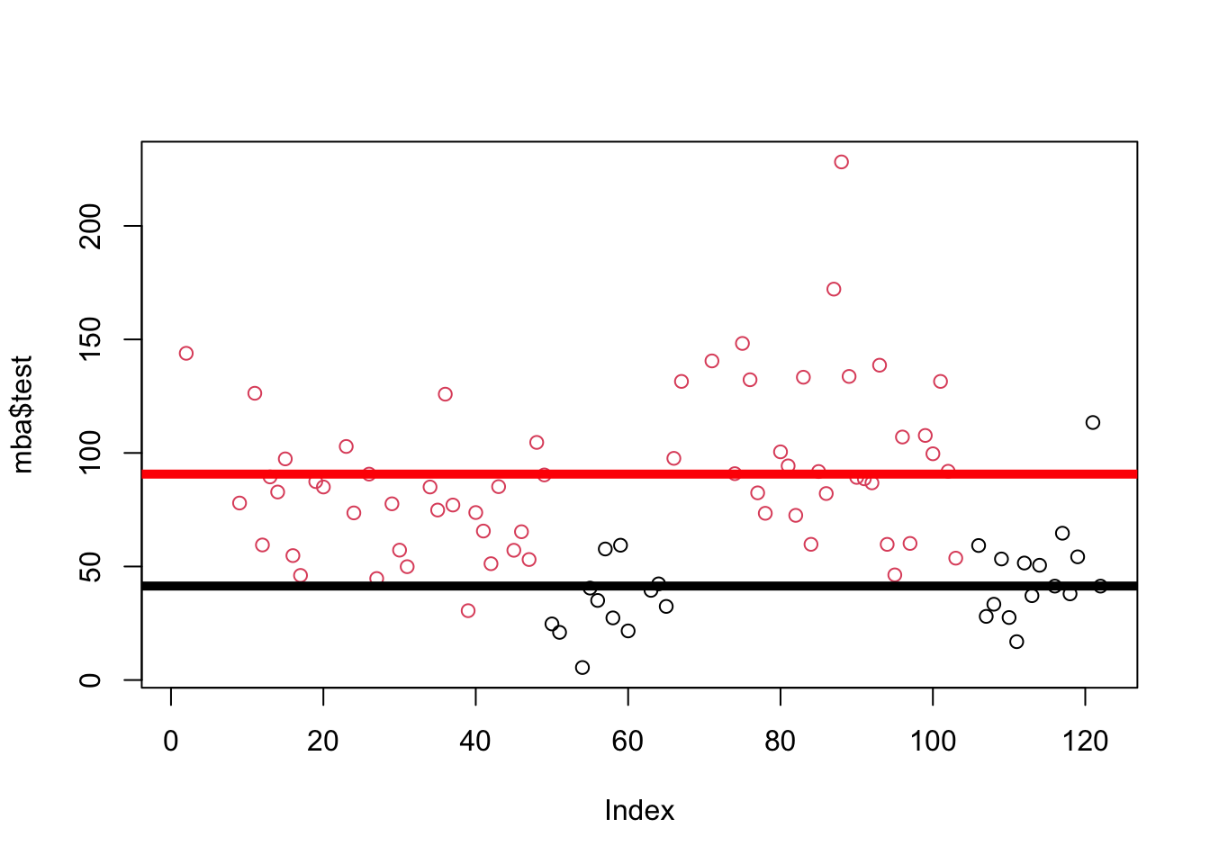 plot(mba$NPI, pch =19, col = mba$sex, ylab ="Narcissism Score", xlab ="Index (Position in Dataset)",main ="Plot of Individual Narcissism Scores\nGrouped By Sex (Red = Male, Black = Female)")abline(h =coef(mod)[1], lwd =5, col ='black')abline(h =coef(mod)[1] +coef(mod)[2], lwd =5, col ='red')