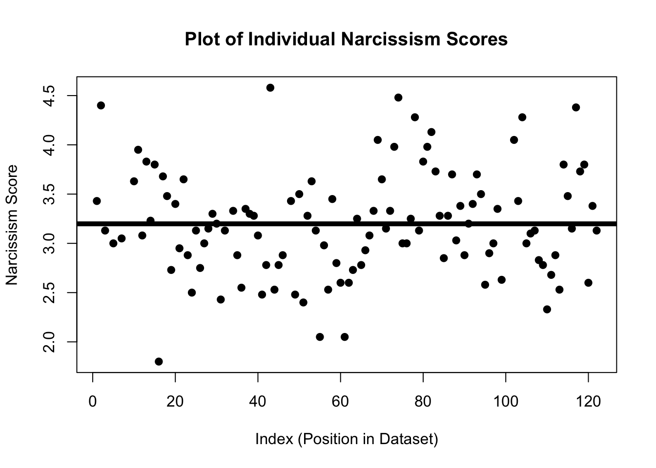 In the graph below, I’m using the plot function to illustrate the individual narcissism scores.