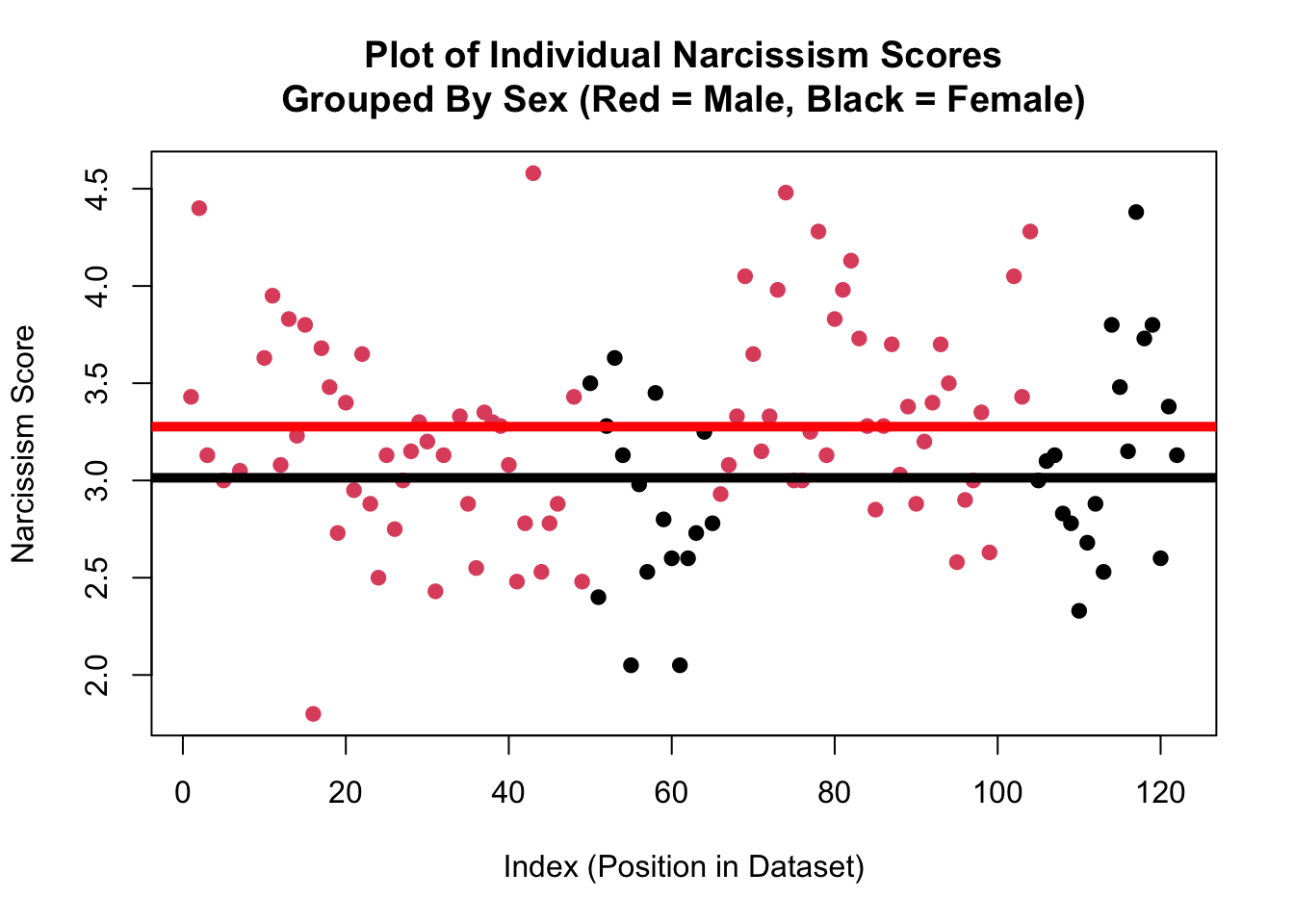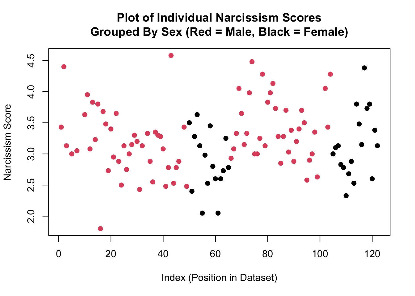 The graph below illustrates the same data, however this time I’ve asked R to color the dots based on the variable sex. In this graph, red dots illustrate the narcissism score for males in the dataset, the black dots illustrate the narcissism score for females in the dataset. Narcissism scores are on the y-axis, and the x-axis again indicates the index of the individual.