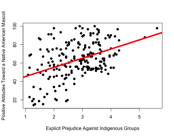 Last lecture, we saw that there was a relationship between how much explicit prejudice against indigenous groups people reported, and their love for a native american mascot.