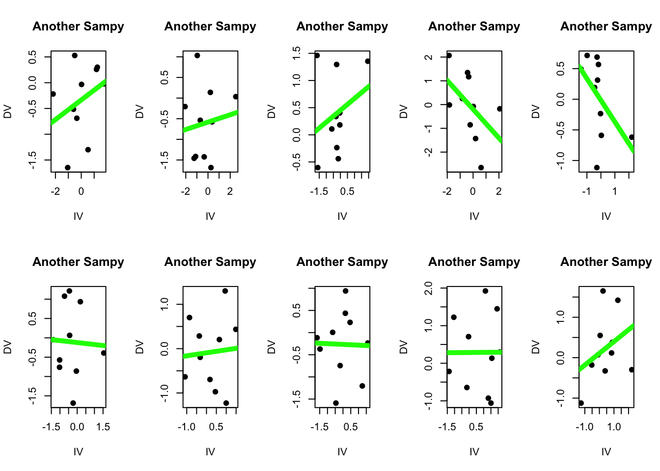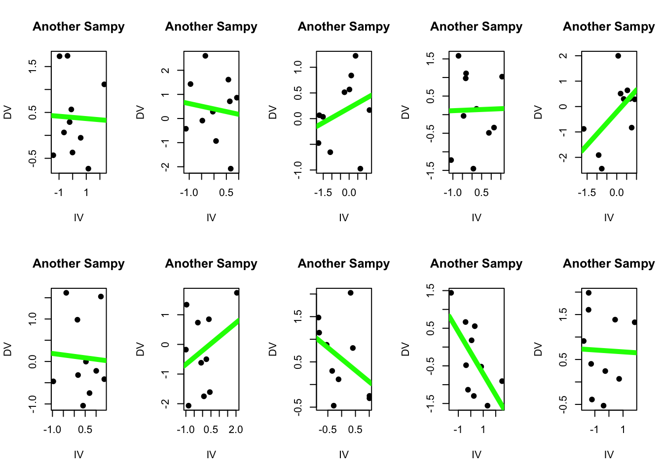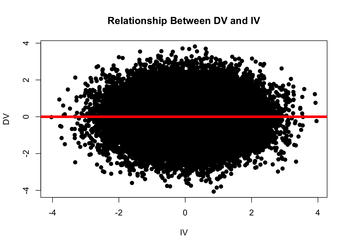 And if we plot the relationship between these two variables, we find that there is no relationship between the DV and the IV. Content warning - some students find the image below existentially terrifying. (What do you see in the graph below? What does this say about you and your personality?)
