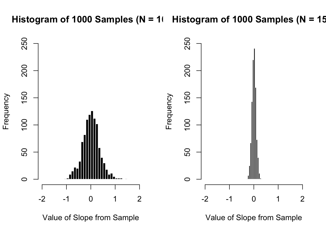 Remember that \(\sigma\) is the standard deviation and \(n\) is the sample size. Based on this equation, you can determine that the standard error will increase as the standard deviation increases, or when the sample size decreases. Remember that standard error is an estimate of sampling error; you can think of the standard error like standard deviation. However, whereas standard deviation describes how much the average individual score differs from the mean, the standard error estimates how much the average individual samples might differ from the estimated slope (the slope you found in your study). Again, we are making this up - we don’t know what the sampling error actually will be, or whether the estimate from our sample is a good estimate of the population. But it’s all we have.