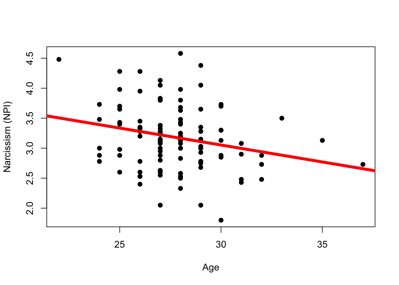 mba <-read.csv("~/Dropbox/!WHY STATS/Chapter Datasets/hormone_data.csv", stringsAsFactors = T)age.mod <-lm(NPI ~ age, data = mba)par(mfrow =c(1,1))plot(NPI ~ age, data = mba, pch =19, xlab ="Age", ylab ="Narcissism (NPI)")abline(age.mod, lwd =5, col ='red')