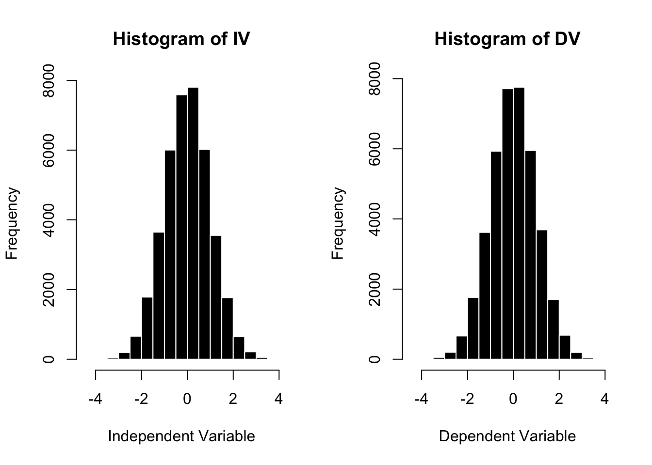 par(mfrow =c(1,2))hist(babby$IV, col ='black', bor ='white', main ="Histogram of IV", xlab ="Independent Variable")hist(babby$DV, col ='black', bor ='white', main ="Histogram of DV", xlab ="Dependent Variable")