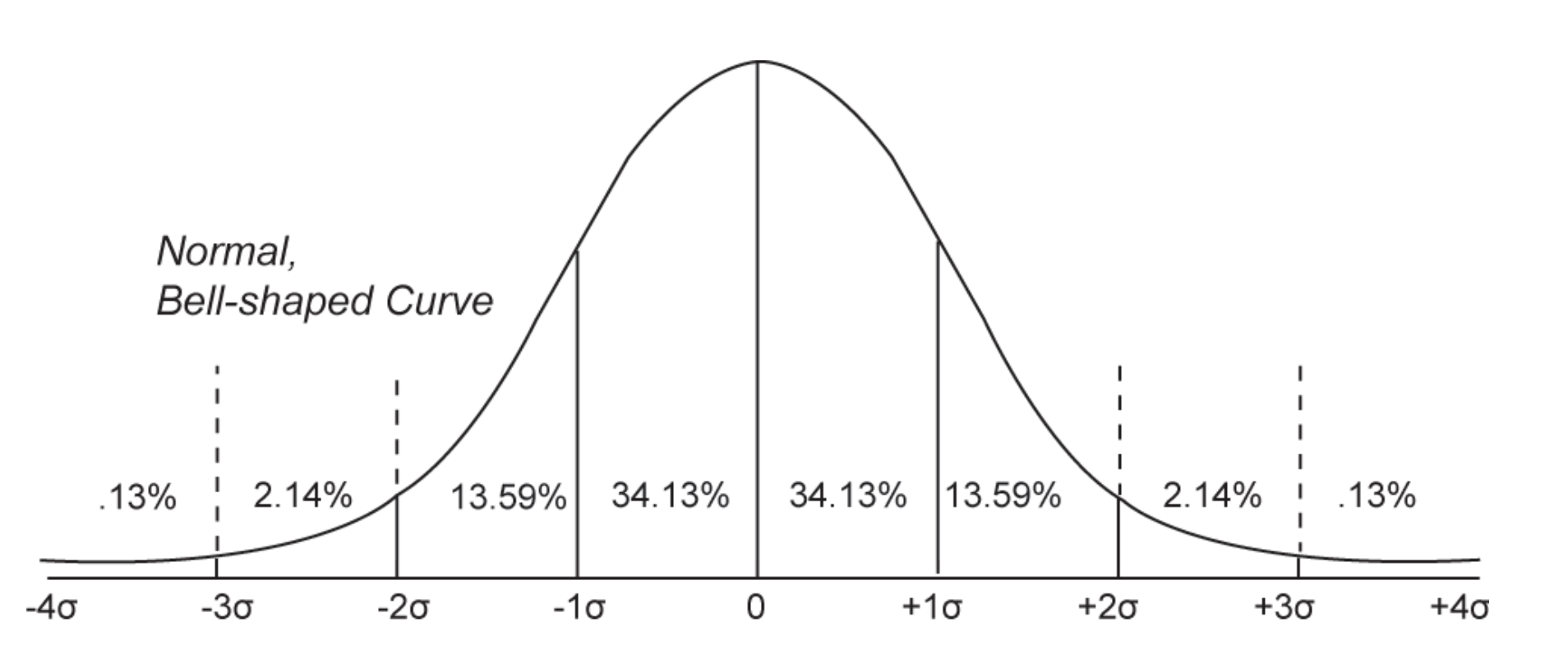 The Central Limit Theorem (see above) allows us to expect that our random samples from the population will be normally distributed. As a reminder, the normal distribution describes a range of possible scores that differ from the mean, and assigns a probability to these scores. For example, we can use the chart below to estimate that 50% of the scores will be above the mean, that 13.59 + 2.14 + .13% = 15.86% of scores will be above 1 standard deviation, that 64.26% of scores will be between -1 and +1 standard deviations of the mean, that .13% of scores will be below 4 standard deviations of the mean, and so on.