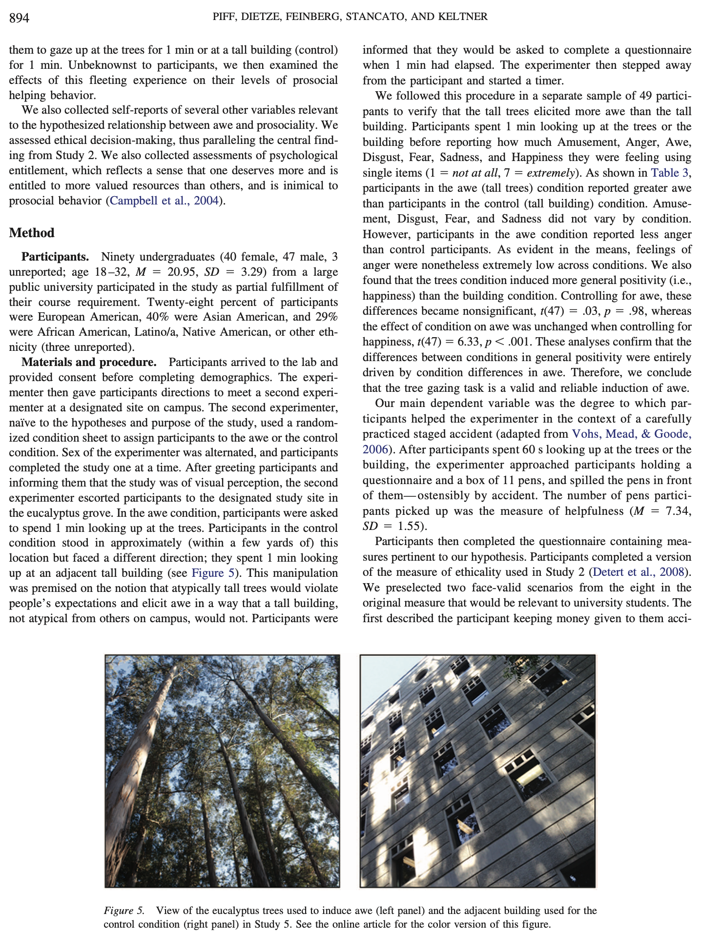 Piff, P. K., Dietze, P., Feinberg, M., Stancato, D. M., & Keltner, D. (2015). Awe, the small self, and prosocial behavior. Journal of personality and social psychology, 108(6), 883. LINK TO FULL ARTICLE