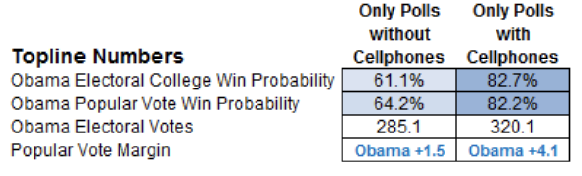 You can see this bias in the data; Obama (the more liberal candidate) was predicted to win by less in the studies that only sampled landline phone owners.