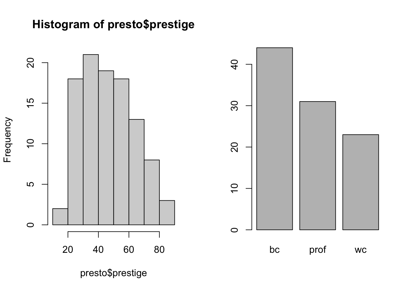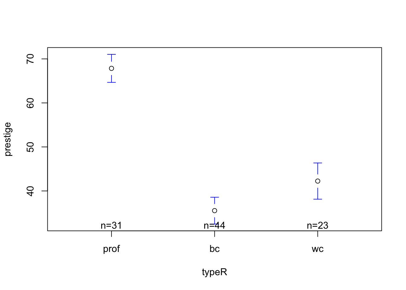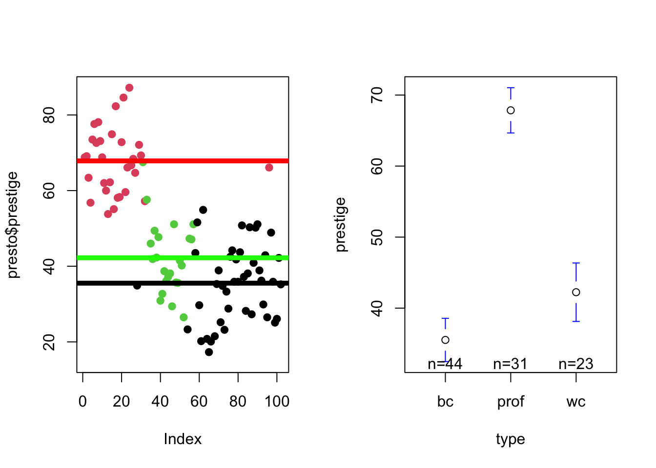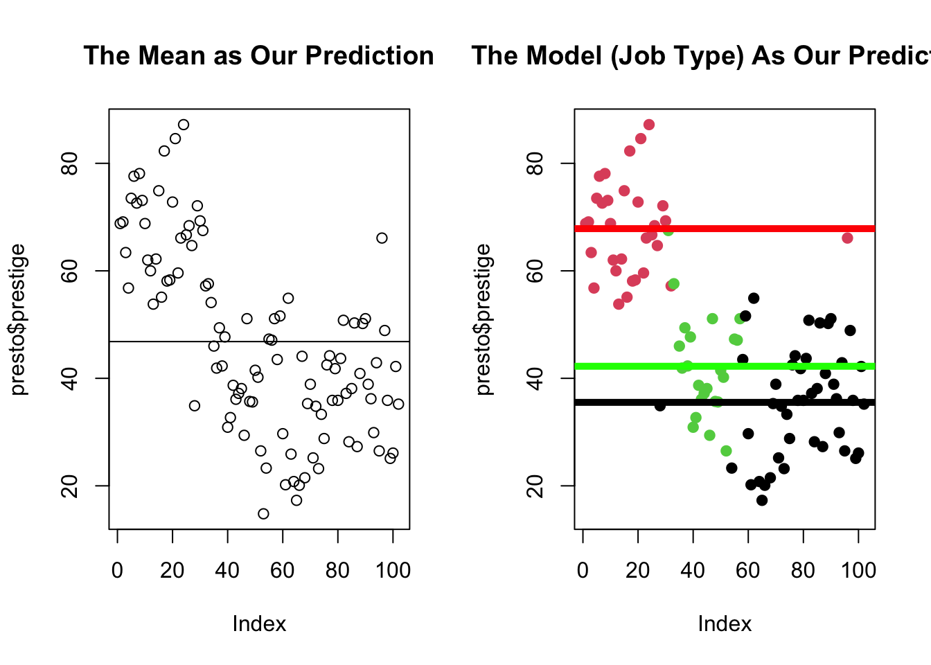 par(mfrow =c(1,2))plot(presto$prestige, main ="The Mean as Our Prediction")abline(h =mean(presto$prestige), )plot(presto$prestige, col = presto$type, pch =19, main ="The Model (Job Type) As Our Prediction")abline(h =coef(mod)[1] +coef(mod)[2], col ='red', lwd =5)abline(h =coef(mod)[1] +coef(mod)[3], col ='green', lwd =5)abline(h =coef(mod)[1], col ='black', lwd =5) # blue collar