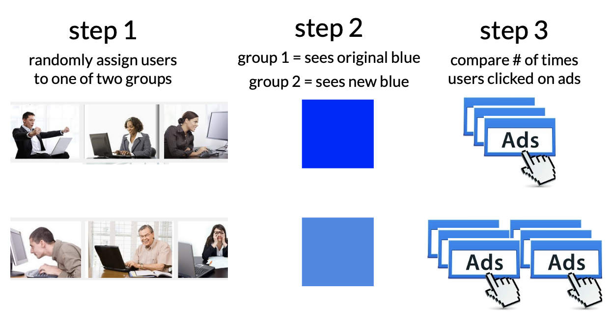 double-blind : the participant didn’t know that google was manipulating the shade of blue to get them to click on ads. the website (google) doesn’t know whats going on.